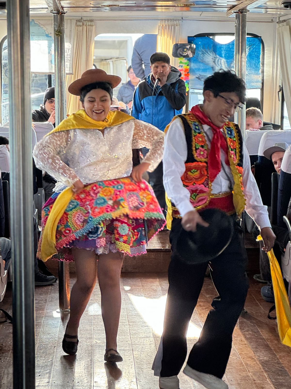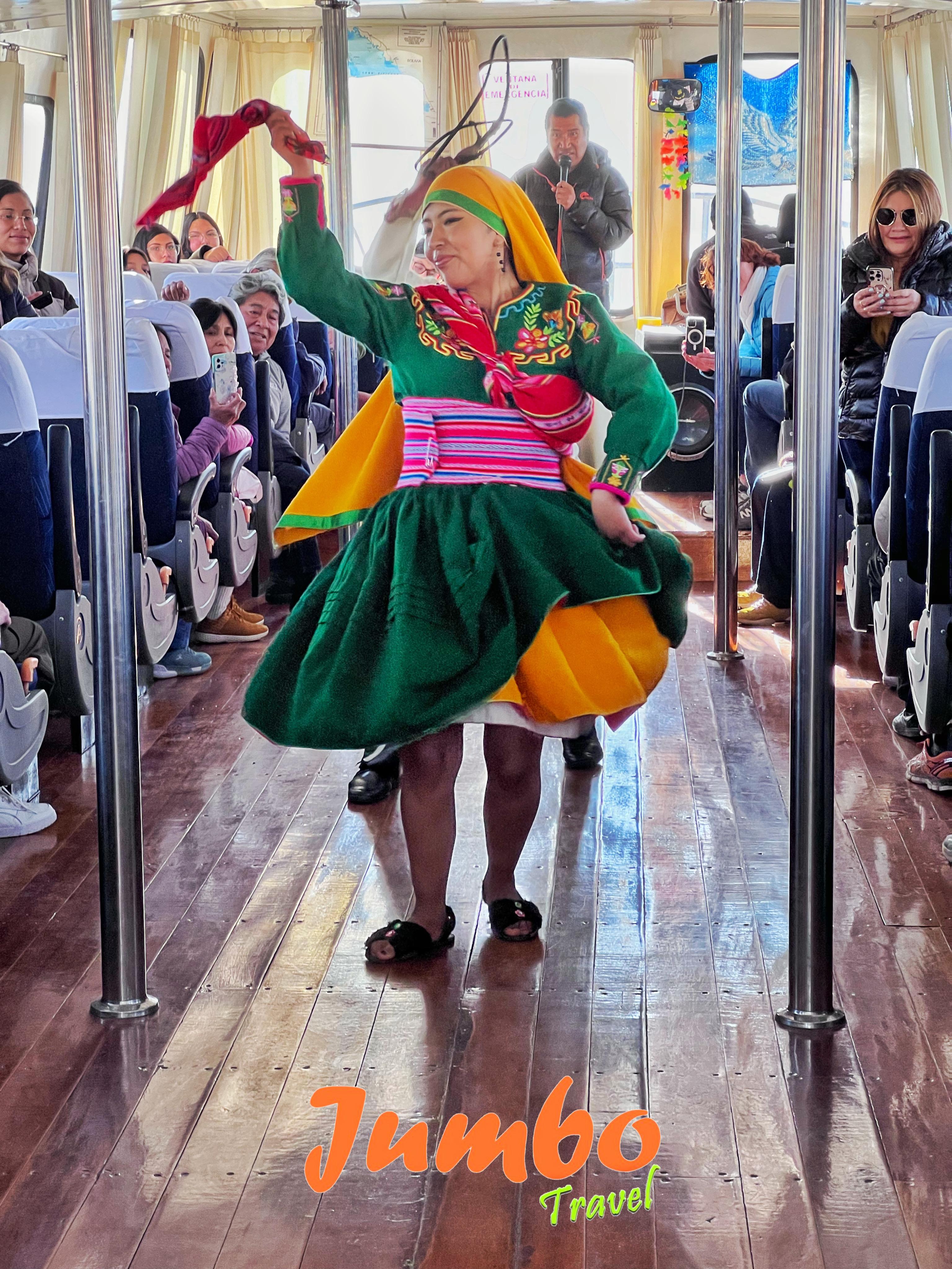 Es un tour único e innovador ofrecido por el operador turístico JUMBO TRAVEL PUNO, que comienza con una muestra de BAILES TRADICIONALES de Puno y de las comunidades alrededor del lago Titicaca, a bordo de una lancha o catamarán veloz. Así inicia esta aventura llena de baile, música y paisajes impresionantes del Lago Titicaca.