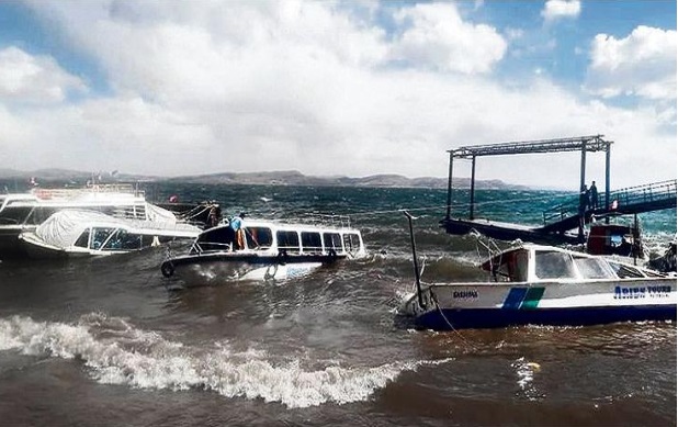 Aunque el Lago Titicaca no es un océano, su tamaño y ubicación geográfica hacen que puedan presentarse oleajes moderados o vientos fuertes, sobre todo: